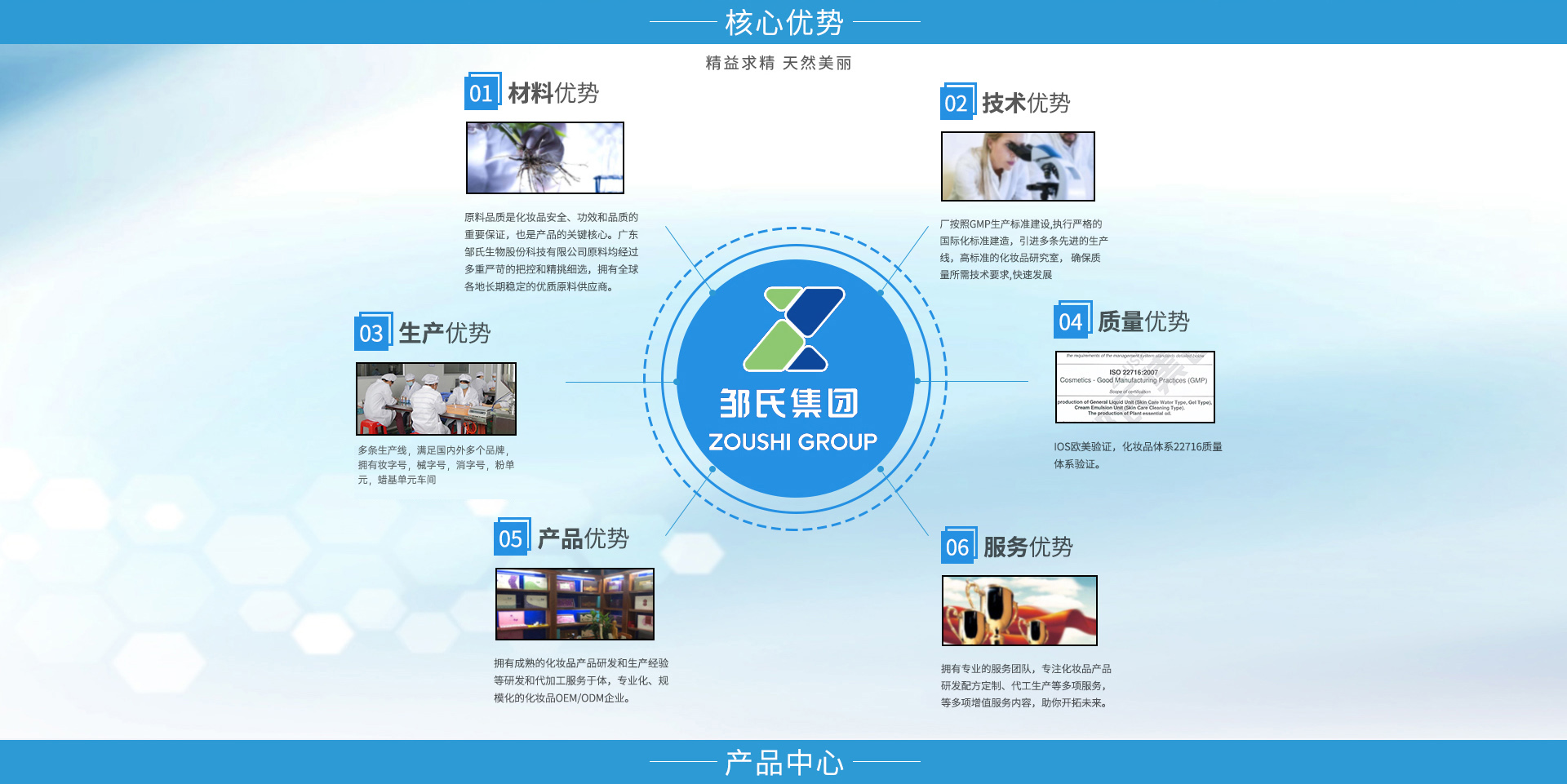 廣東鄒氏生物科技股份有限公司是一家集原料研制、配方開發(fā)、加工生產及配套性服務為一體的全球化化妝品OEM/ODM服務企業(yè)。鄒氏生物秉承“精益求精,天然美麗”的經營理念,始終孜孜不倦的在美業(yè)領域深耕,經過不斷發(fā)展完善與技術提升,在行業(yè)內頗具口碑和影響力。公司擁有雄厚的資金實力、先進的生產設備以及大批高精專的人才儲備,旨在打造一個純自主研發(fā),純自主生產以及管理的高科技日用美妝OEM/ODM品牌。 在延續(xù)高質量產品和服務的同時,鄒氏生物始終秉承著純粹的生產理念,在研發(fā)、生產、品控、營銷等多方面升級,配備雄厚的科研力量,引進先進生產設備,遵循嚴苛的品質管理標準,提供專業(yè)的全方位營銷服務,最大程度地實現(xiàn)資源整合,致力于成為世界優(yōu)秀化妝品工廠。為廣大品牌商以及消費市場輸送品質優(yōu)越、高效安全的日用化工、美容美妝、肌膚護理產品。